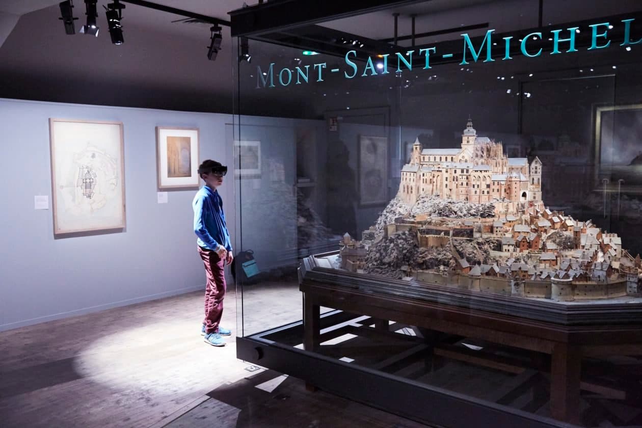 A visitor at the Musée des Plans-Reliefs in Paris uses Microsoft HoloLens to get a mixed reality experience around a 3D relief map of the landmark Mont-Saint-Michel. (Microsoft Photo)